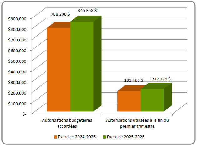 En date du 30 juin des années 2024 et 2025, les autorisations totales disponibles du CMF s’élevaient à 788 200 057 dollars en 2024-2025, et 846 357 744 dollars en 2025‑2026. Les autorisations utilisées à la fin du premier trimestre totalisaient 191 466 374 dollars en 2024-2025 et 212 279 547 dollars en 2025-2026.