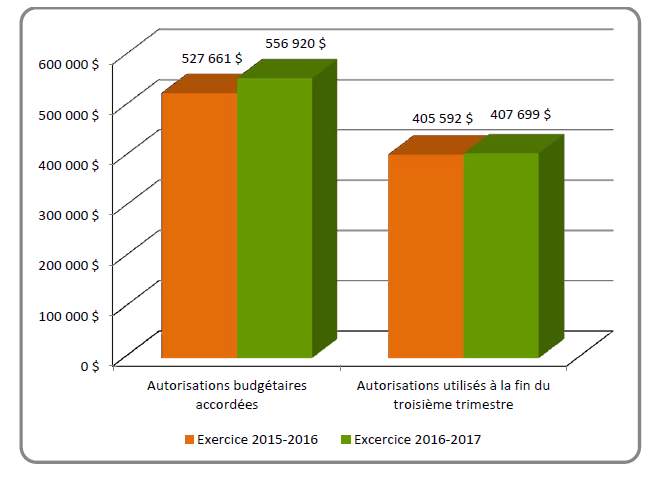 En date du 31 décembre des années 2015 et 2016, le CMF prévoyait dépenser respectivement 527 661 533 dollars en 2015-2016, et 556 920 085 dollars en 2016-2017. Les autorisations utilisées à la fin du troisième trimestre totalisaient 405 592 285 dollars en 2015-2016 et 407 699 187 dollars en 2016-2017.