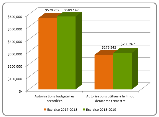 En date du 30 septembre des années 2017 et 2018, le CMF prévoyait dépenser 570 758 699 dollars en 2017-2018, et 583 147 223 dollars en 2018-2019. Les autorisations utilisées à la fin du deuxième trimestre totalisaient 276 342 133 dollars en 2017-2018 et 290 267 119 dollars en 2018-2019.