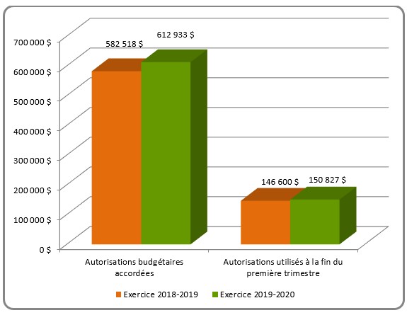 En date du 30 juin des années 2018 et 2019, le CMF prévoyait dépenser 582 518 253 dollars en 2018-2019, et 612 932 991 dollars en 2019-2020. Les autorisations utilisées à la fin du premier trimestre totalisaient 146 600 326 dollars en 2018-2019 et 150 826 834 dollars en 2019-2020.