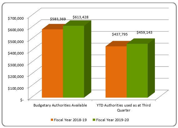 As at December 31, 2018 and 2019, FJA planned to spend $583,369,192 in 2018-19 and $613,428,049 in 2019-20. Authorities used as at the third quarter totalled $437,795,722 in 2018-19 and $459,142,842 in 2019-20.