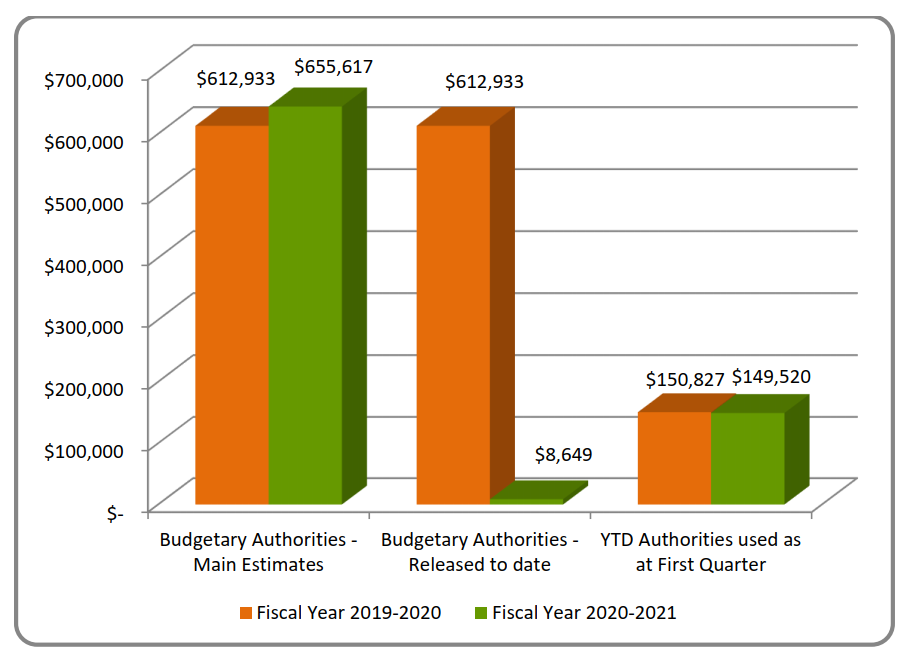 As at June 30, 2020, the total authorities available to FJA are $604.3 million lower compared with the same quarter last fiscal year. This variance is due to delays in approvals for the full supply of the 2020-21 Main Estimates. The amount shown reflects that which has been approved through the first and second interim supply bills.