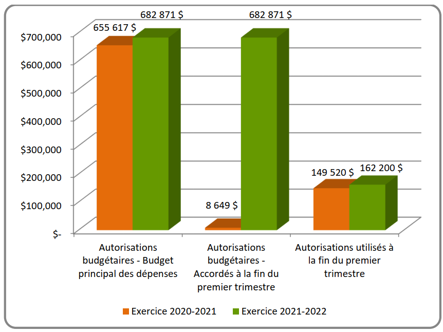 En date du 30 juin des années 2020 et 2021, le CMF prévoyait dépenser 655 616 954 dollars en 2020-2021, et 682 870 730 dollars en 2021-2022. Les autorisations utilisées à la fin du premier trimestre totalisaient 149 519 793 dollars en 2020-2021 et 162 200 125 dollars en 2021-2022.