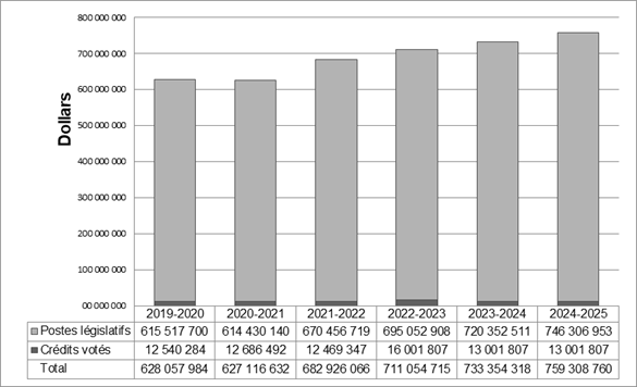 Le tableau ci-dessous présente, pour le soutien aux juges de nomination fédérale, les dépenses budgétaires pour l’exercice 2022‑2023 ainsi que les dépenses prévues pour cet exercice et les deux exercices suivants.