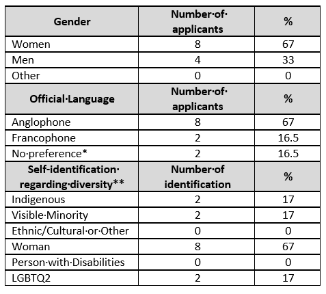 The Advisory Board’s Terms of Reference stipulate that, in establishing a list of three to five qualified and functionally bilingual candidates, members must seek to support the Government of Canada’s intent to achieve a gender-balanced Supreme Court of Canada that also reflects the diversity of members of Canadian society, including Indigenous peoples, persons with disabilities and members of ethnic, linguistic and other minority communities, including those whose members’ gender identity or sexual orientation differs from that of the majority.
